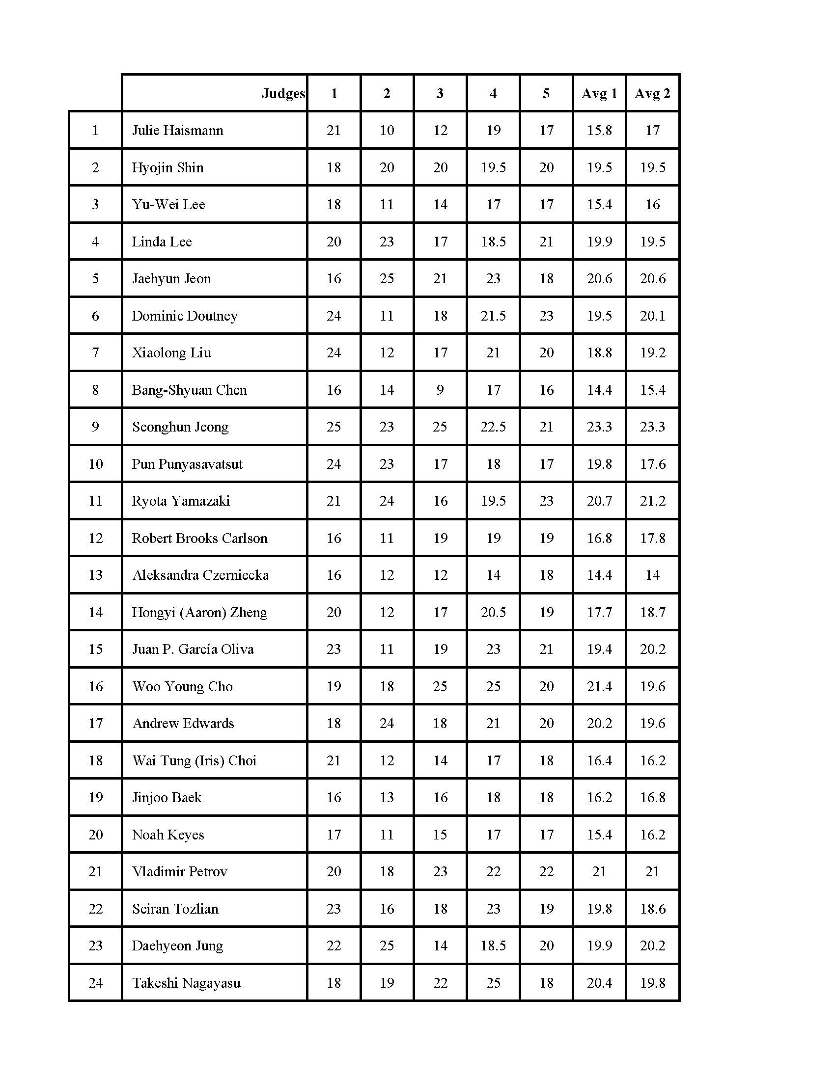 The trustee will announce the six highest rankings. In case of a pianist in 7th or 8th place receiving a very close number to the 6th, adding those pianists to the finals will be considered, without names. After that decision is made names will be revealed without the numbers or placement, just in alphabetical order.